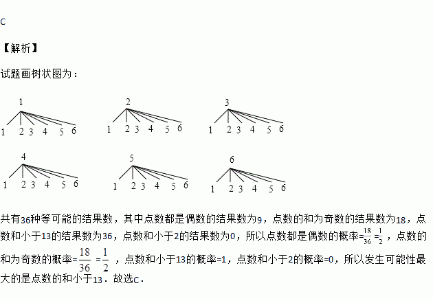 质地均匀的骰子六个面分别刻有1到6的点数,掷两次骰子,得到向上一面的两个点数,则下列事件中,发生可能性最大的是( )