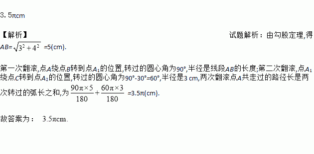 如图,有一长为4 cm,宽为3 cm的长方形木板在桌面上做无滑动的翻滚(顺时针方向),木板上的顶点A的位置变化为A→A1→A2,其中第二次翻滚被桌面上一小木块挡住,使木板边沿A2C与桌面成30°角,则点A翻滚到A2位置时,共走过的路径长为____.