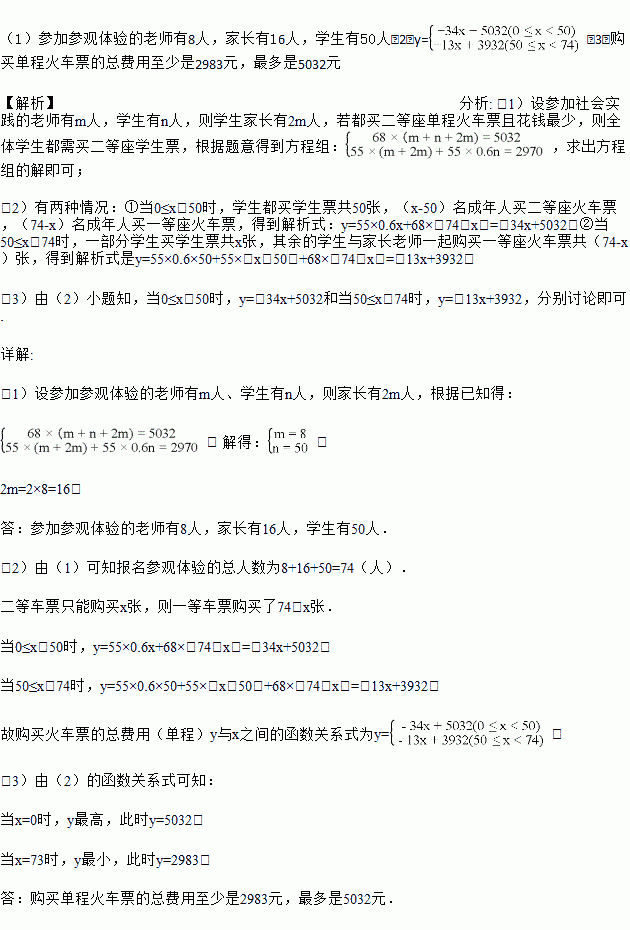 (3)请你做一个预算,按第(2)小题中的购票方案,购买单程火车票的总费用至少是多少钱?最多是多少钱?