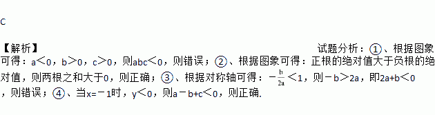 C 【解析】试题分析:①、根据图象可得:a<0,b>0,c>0,则abc<0,则错误;②、根据图象可得:正根的绝对值大于负根的绝对值,则两根之和大于0,则正确;③、根据对称轴可得:-<1,则-b>2a,即2a+b<0,则错误;④、当x=-1时,y<0,则a-b+c<0,则正确.
