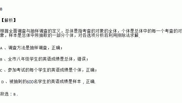 C. 参加考试的每个学生的英语成绩是个体 D. 被抽到的600名学生的英语成绩是样本