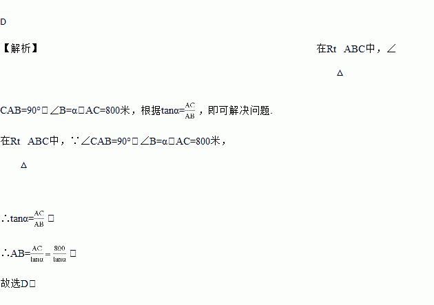 如图,某地修建高速公路,要从A地向B地修一条隧道(点A、B在同一水平面上).为了测量A、B两地之间的距离,一架直升飞机从A地出发,垂直上升800米到达C处,在C处观察B地的俯角为α,则A、B两地之间的距离为( )