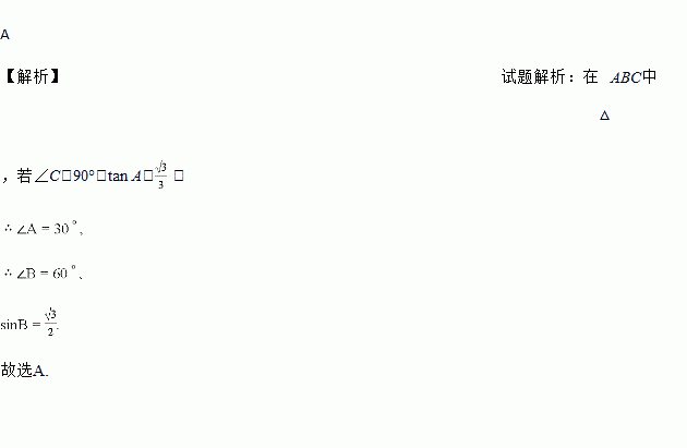 在△ABC中,若∠C=90°,tan A=,则sin B的值为( )