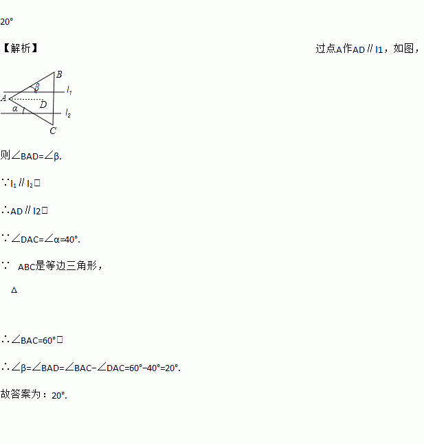 如图,已知直线l1∥l2,将等边三角形如图放置,若∠α=40°,则∠β等于______.