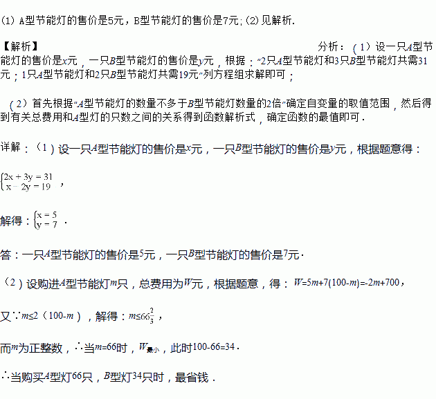 学校准备购进一批A、B两型号节能灯,已知2只A型节能灯和3只B型节能灯共需31元;1只A型节能灯和2只B型节能灯共需19元.