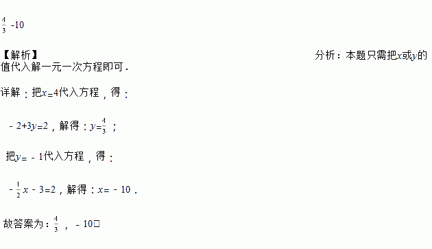 在二元一次方程-x+3y=2中,当x=4时,y=_______;当y=-1时,x=______.