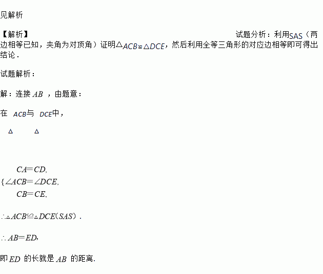 如图,有一池塘,要测池塘两端A、B的距离,可先在平地上取一个点C,从点C不经过池塘可以直接到达点A 和B. 连接AC并延长到点D,使CD =CA. 连接BC 并延长到点E,使CE =CB. 连接DE,那么量出DE的长就是A,B的距离.为什么?