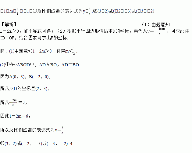 (2)如图,若该反比例函数的图像经过?ABOD的顶点D,点A,B的坐标分别为(0,3),(-2,0).