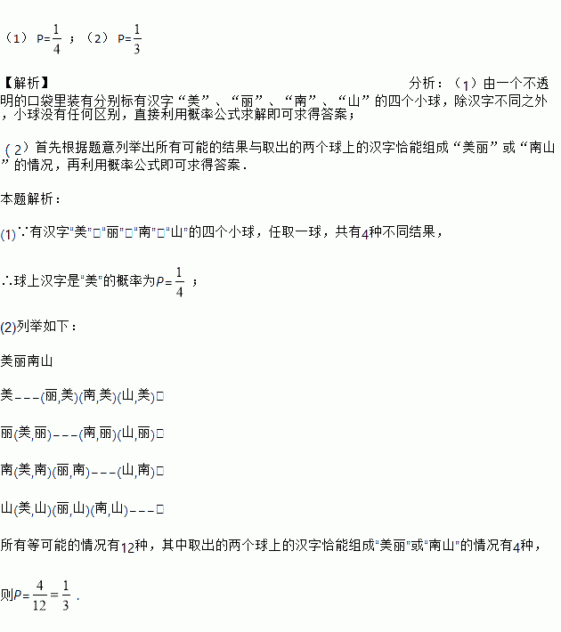 (1) P=;(2) P= 【解析】分析:(1)由一个不透明的口袋里装有分别标有汉字“美”、“丽”、“南”、“山”的四个小球,除汉字不同之外,小球没有任何区别,直接利用概率公式求解即可求得答案; (2)首先根据题意列举出所有可能的结果与取出的两个球上的汉字恰能组成“美丽”或“南山”的情况,再利用概率公式即可求得答案. 本题解析: (1)∵有汉字“美”、“丽”、“南”、“山”...