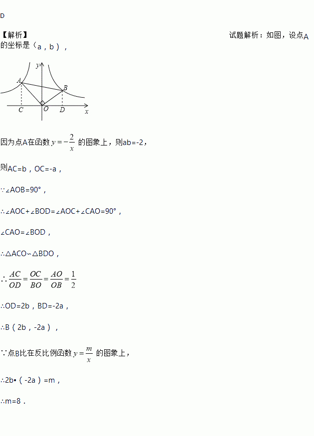 D 【解析】试题解析:如图,设点A的坐标是(a,b), 因为点A在函数的图象上,则ab=-2, 则AC=b,OC=-a, ∵∠AOB=90°, ∴∠AOC+∠BOD=∠AOC+∠CAO=90°, ∠CAO=∠BOD, ∴△ACO∽△BDO, ∴ ∴OD=2b,BD=-2a, ∴B(2b,-2a), ∵点B比在反比例函数的图象上, ...