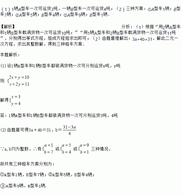 (1)1辆A型车一次可运货3吨,一辆B型车一次可运货4吨;(2)三种方案:①A型车1辆;B型车7辆;②A型车5辆;B型车4辆;③A型车9辆;B型车1辆. 【解析】分析:(1)根据“用2辆A型车和1辆B型车载满货物一次可运货10吨;”“用1辆A型车和2辆B型车载满货物一次可运货11吨”,分别得出等式方程,组成方程组求出即可;(2)由题意理解出:3a+4b=31,解此二元一次方程,求出其整数解,...