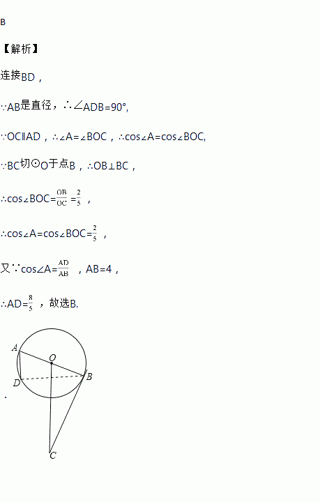 如图,⊙O的直径AB=4,BC切⊙O于点B,OC平行于弦AD,OC=5,则AD的长为( )
