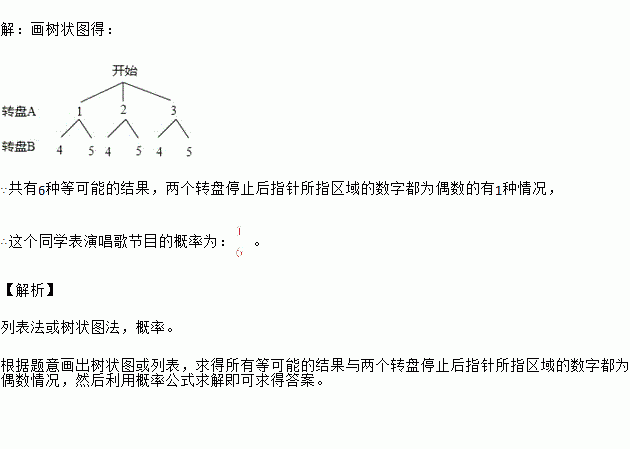 某校初三年级(1)班要举行一场毕业联欢会.规定每个同学分别转动下图中两个可以自由转动的均匀转盘A、B(转盘A被均匀分成三等份.每份分別标上1.2,3三个钕宇.转盘B被均匀分成二等份.每份分别标上4,5两个数字).若两个转盘停止后指针所指区域的数字都为偶数(如果指针恰好指在分格线上.那么重转直到指针指向某一数字所在区域为止).则这个同学要表演唱歌节目.请求出这个同学表演唱歌节目的概率(要求用画树状图或列表方法求解)![]()
