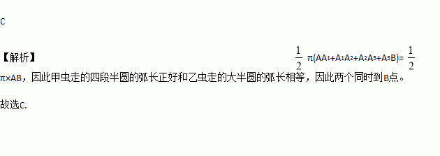 如图的五个半圆,邻近的两半圆相切,两只小虫同时出发,以相同的速度从A点到B点,甲虫沿大半圆弧ACB路线爬行,乙虫沿小半圆弧ADA1、A1EA2、A2FA3、A3GB路线爬行,则下列结论正确的是 ( )