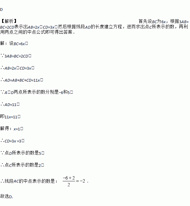 如图,数轴上有A、B、C、D四个整数点(即各点均表示整数),且3AB=BC=2CD.若A、D两点所表示的数分别是﹣6和5,则线段AC的中点所表示的数是( )