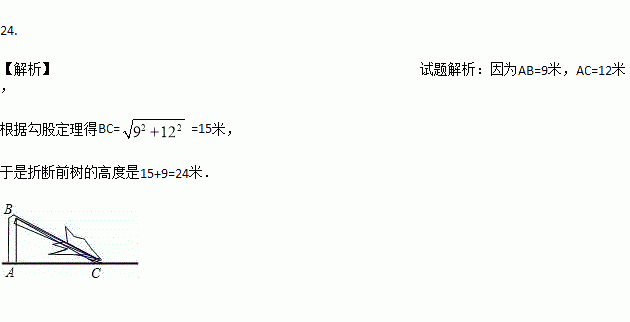 如图,一根树在离地面9米处断裂,树的顶部落在离底部12米处.树折断之前有______米.