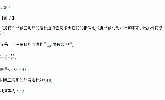 一个三角形的边长分别为5 cm,8 cm,12 cm,另一个三角形的最长边为7.2cm,则当另一个三角形的另外两边长是_______________cm时,这两个三角形相似.