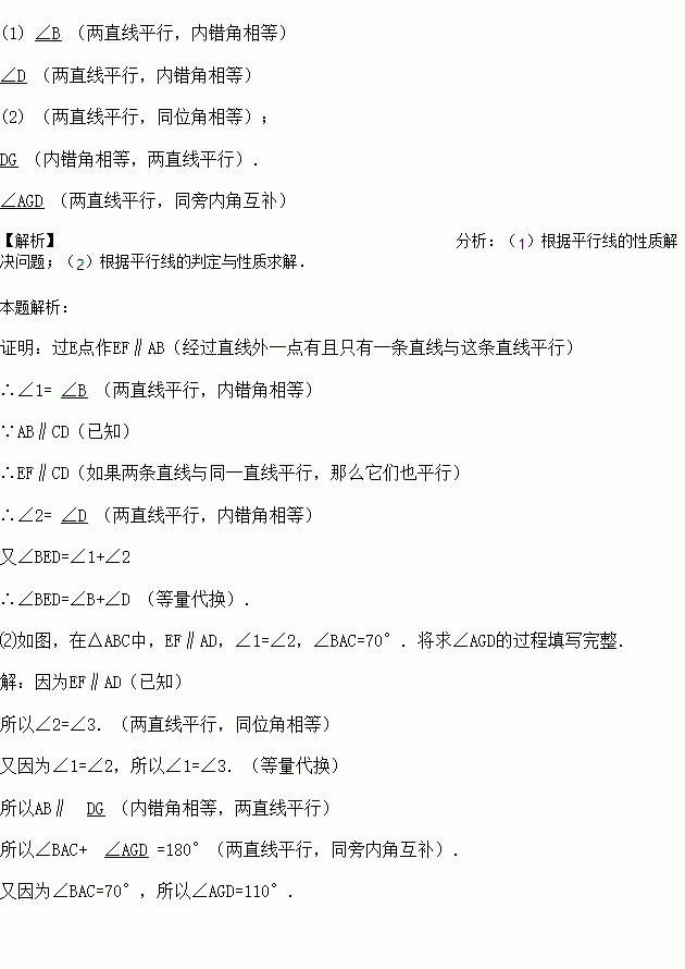 ⑵如图,在△ABC中,EF∥AD,∠1=∠2,∠BAC=70°.将求∠AGD的过程填写完整.