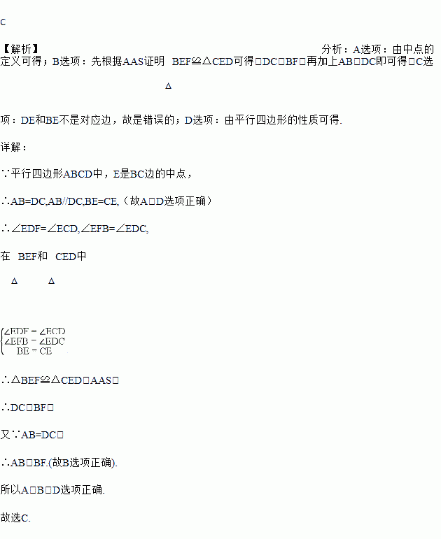 如图,平行四边形ABCD中,E是BC边的中点,连接DE并延长交AB的延长线于点F,则在题中条件下,下列结论不能成立的是( )