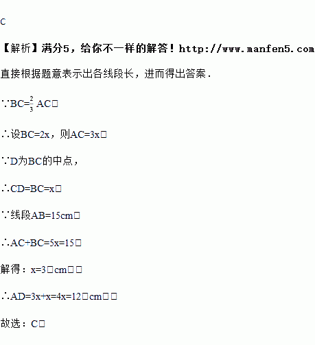 如图,线段AB=15cm,且C点在AB上,BC=AC,D为BC的中点,则线段AD的长为( )