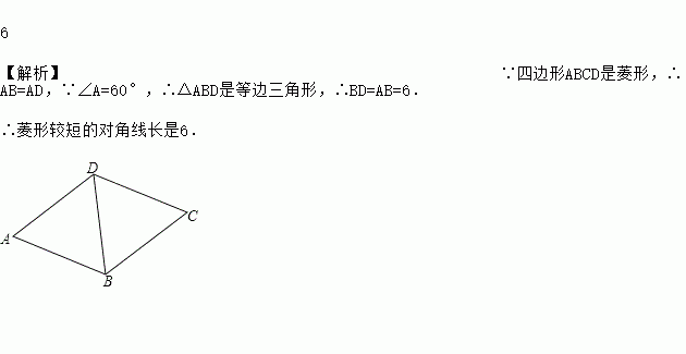 已知菱形的边长为6,一个内角为60°,则菱形较短的对角线长是 .