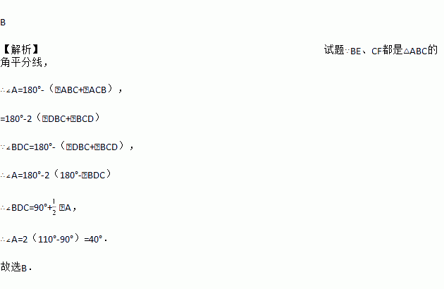 如图,BE、CF都是△ABC的角平分线,且∠BDC=110°,则∠A=( )