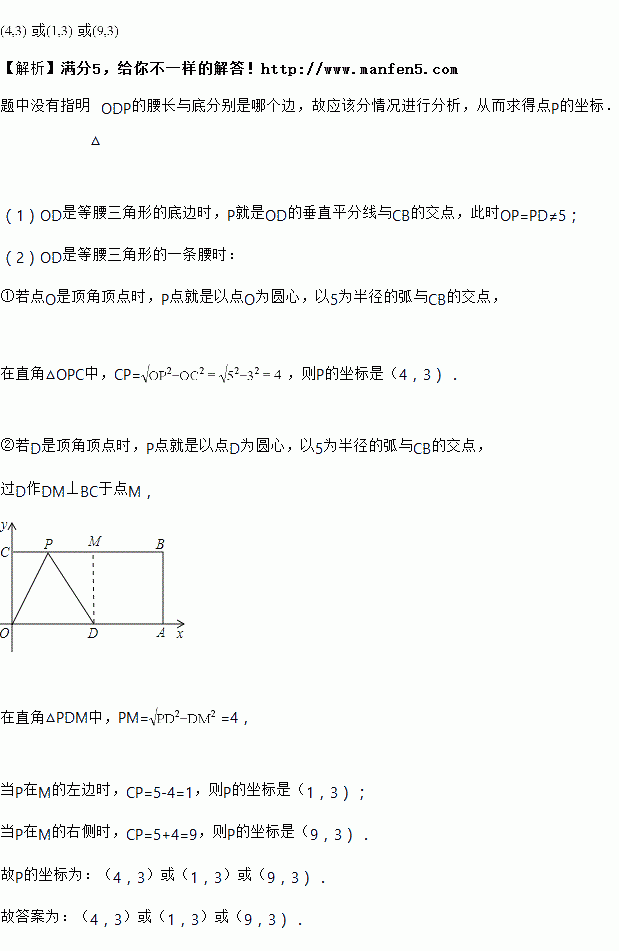 如图,在平面直角坐标系中,为原点,四边形是长方形,点,的坐标分别为,,是的中点,点在边上运动,当是腰长为5的等腰三角形时,点的坐标为_______.