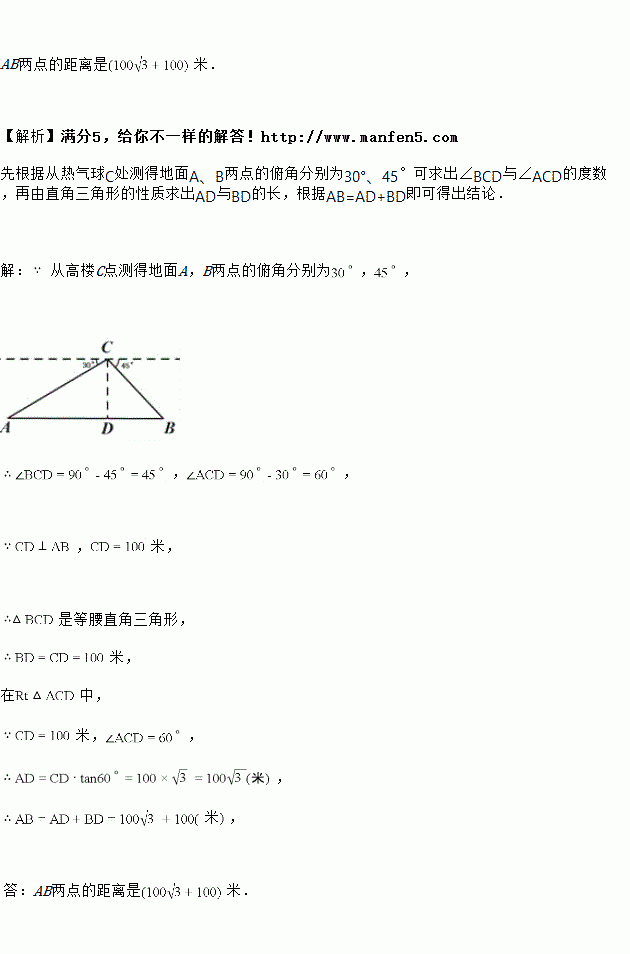 ,如果此时高楼C点的高度CD 为100米,点A,D,B在同一直线上,求AB两点的距离。(结果保留根号)