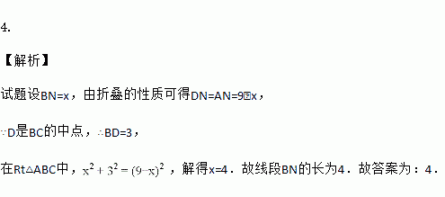 如图,Rt△ABC中,AB=9,BC=6,∠B=90°,将△ABC折叠,使A点与BC的中点D重合,折痕为MN,则线段BN的长为_____.