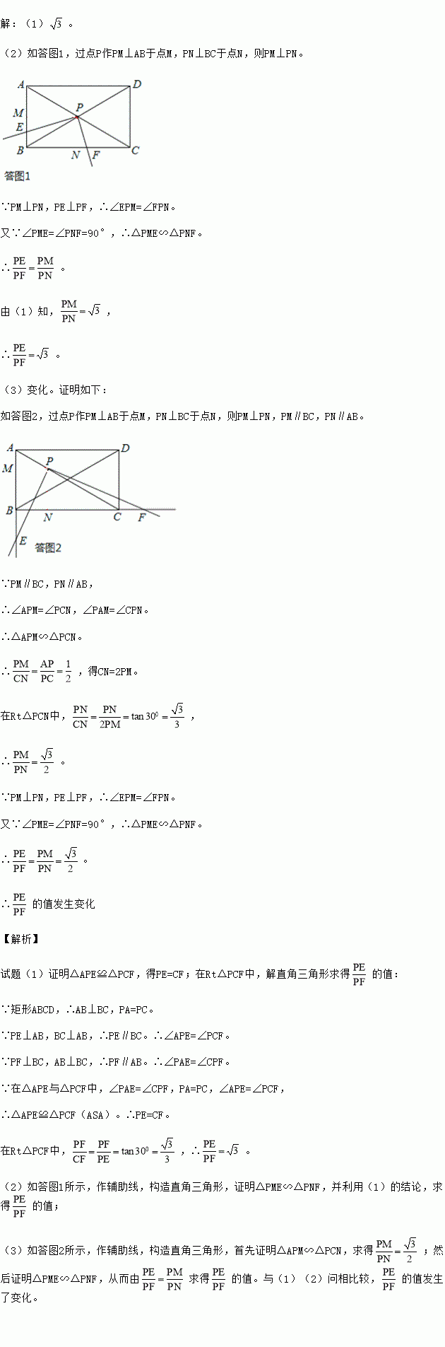 如图,矩形ABCD中,∠ACB=30°,将一块直角三角板的直角顶点P放在两对角线AC,BD的交点处,以点P为旋转中心转动三角板,并保证三角板的两直角边分别于边AB,BC所在的直线相交,交点分别为E,F.