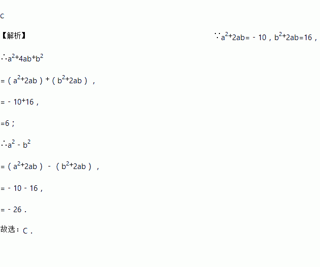 若a2+2ab=﹣10,b2+2ab=16,则多项式a2+4ab+b2与a2﹣b2的值分别为( )