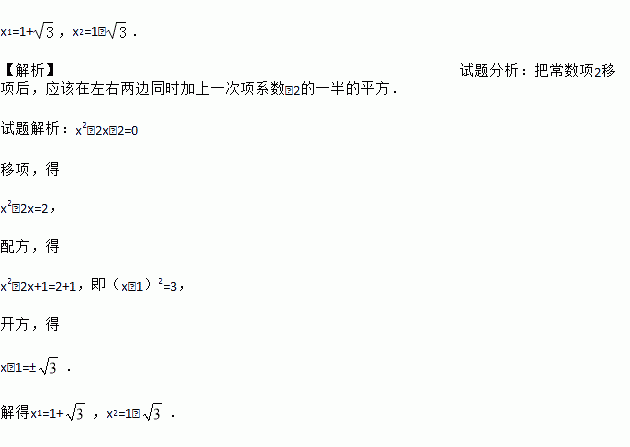 x1=1+,x2=1﹣. 【解析】试题分析:把常数项2移项后,应该在左右两边同时加上一次项系数﹣2的一半的平方. 试题解析:x2﹣2x﹣2=0 移项,得 x2﹣2x=2, 配方,得 x2﹣2x+1=2+1,即(x﹣1)2=3, 开方,得 x﹣1=±. 解得x1=1+,x2=1﹣.
