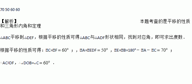 如图所示,平移△ABC可得到△DEF,如果∠A=50°,∠C=60°,那么∠E=____度,∠EDF=___度,∠F=______度,∠DOB=_______度.