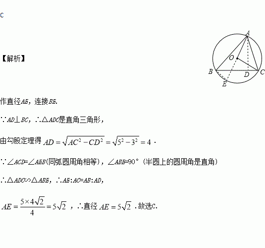 如图,△ABC是⊙O的内接三角形,AD⊥BC于点D,且AC=5,CD=3,AB=4 ,则⊙O的直径等于( )