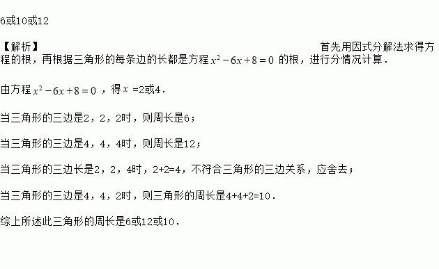 三角形的每条边的长都是方程的根,则三角形的周长是 .