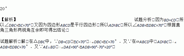 如图,在ABCD中,DB=CD,∠C=70°,AE⊥BD于点E.试求∠DAE的度数.