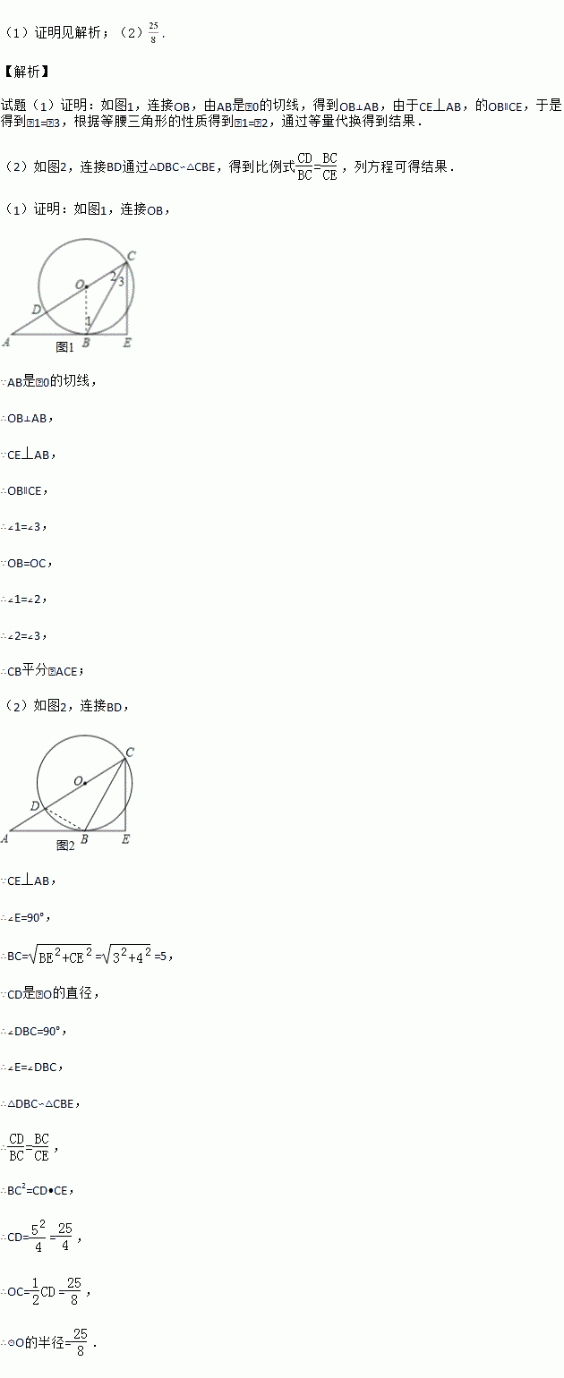 如图,已知三角形ABC的边AB是0的切线,切点为B. AC经过圆心0并与圆相交于点D,C,过C作直线CE丄AB,交AB的延长线于点E.