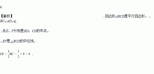 如图,在平行四边形ABCD中,AD=8,点E,F分别是BD,CD的中点,则EF=____________________________________.