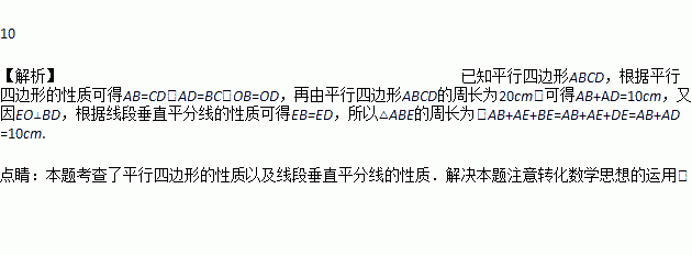 如图,平行四边形ABCD 的周长为20cm,对角线相交于点 O,且 EO⊥BD 于点 O 交AD 于点 E,则△ABE 的周长为 ________________cm.