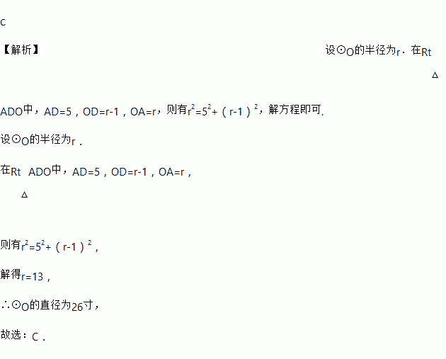 《九章算术》是我国古代第一部自成体系的数学专著,代表了东方数学的最高成就.它的算法体系至今仍在推动着计算机的发展和应用.书中记载:“今有圆材埋在壁中,不知大小,以锯锯之,深一寸,锯道长一尺,问径几何?”译为:“今有一圆柱形木材,埋在墙壁中,不知其大小,用锯去锯这木材,锯口深1寸(ED=1寸),锯道长1尺(AB=1尺=10寸)”,问这块圆形木材的直径是多少?”
