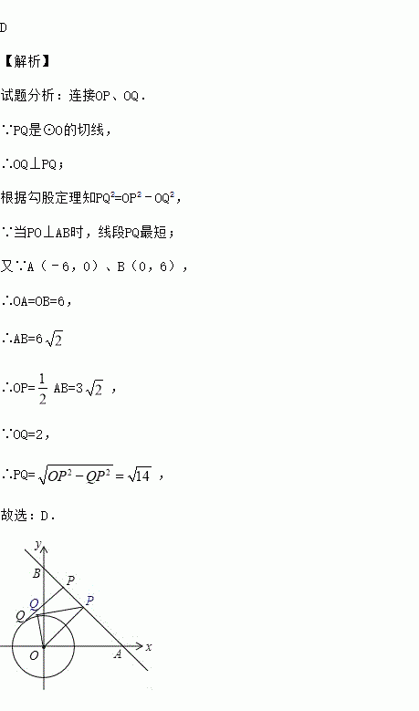 如图,在平面直角坐标系xOy中,直线AB经过点A(6,0)、B(0,6),⊙O的半径为2(O为坐标原点),点P是直线AB上的一动点,过点P作⊙O的一条切线PQ,Q为切点,则切线长PQ的最小值为( )