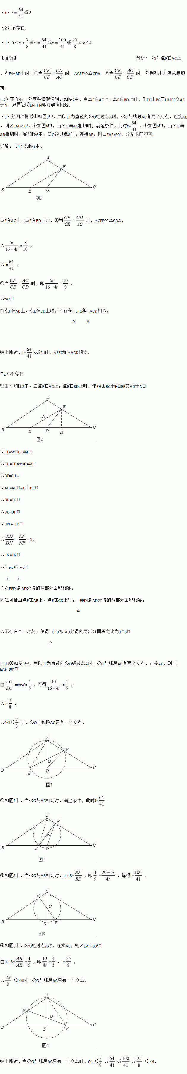 如图,在△ABC中,已知AB=AC=10cm,BC=16cm,AD⊥BC于D,点E、F分别从B、C两点同时出发,其中点E沿BC向终点C运动,速度为4cm/s;点F沿CA、AB向终点B运动,速度为5cm/s,设它们运动的时间为x(s).