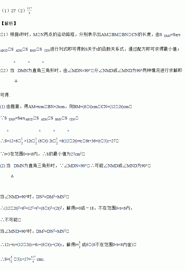 如图,矩形ABCD中,AB=6cm,BC=12cm.. 点M从点A开始沿AB边向点B以1cm/秒的速度向B点移动,点N从点B开始沿BC边以2cm/秒的速度向点C移动. 若M, N分别从A, B点同时出发,设移动时间为t (0<t<6),△DMN的面积为S.