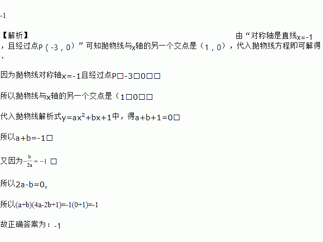 如图,抛物线y=ax2+bx+1(a≠0)经过点A(-3,0),对称轴为直线x= -1,则(a+b)(4a-2b+1)的值为____________.