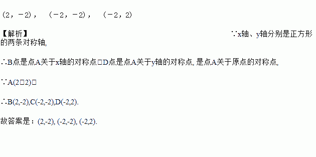 已知正方形ABCD在坐标轴上的位置如图所示,x轴、y轴分别是正方形的两条对称轴,若A(2,2),则B点的坐标为______,C点的坐标为________,D点的坐标为___________.