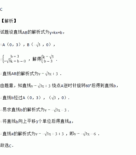 在直角坐标系中,一直线a向下平移3个单位后所得直线b经过点A(0,3),将直线b绕点A顺时针旋转60°后所得直线经过点B(﹣