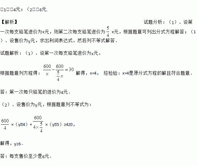 (2)若要求这两次购进的铅笔按同一价格全部销售完毕后获利不低于420元,问每支售价至少是多少元?