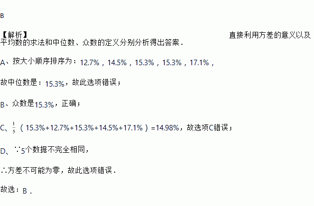 A. 中位数是12.7% B. 众数是15.3%