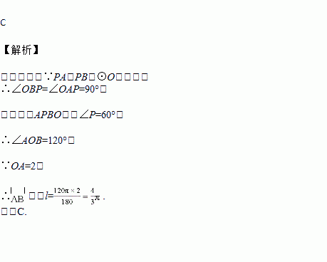 如图,PA、PB是⊙O的切线,切点分别为A、B,若OA=2,∠P=60°,则的长为( )