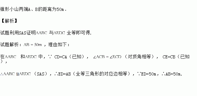 有一座锥形小山,如图,要测量锥形小山两端A、B的距离,先在平地上取一个可以直接到达A和B的点C,连接AC并延长到D,使CD=CA,连接BC并延长到E,使CE=CB,连接DE,量出DE的长为50m,你能求出锥形小山两端A、B的距离吗?